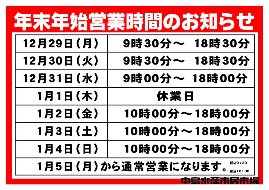 年末年始営業時間のおしらせ